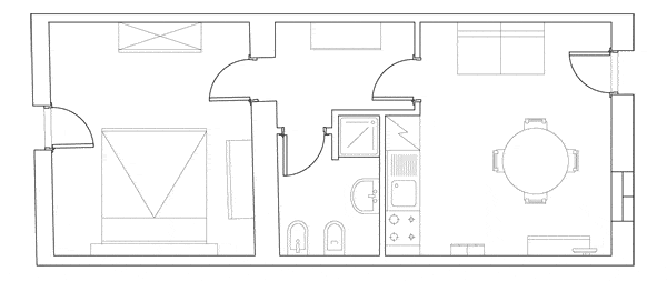 Spazioso bilocale affacciato sul giardino privato. Per tutta la famiglia, con un piccolo vano aggiuntivo che consente di sfruttare al meglio gli ambienti a disposizione.