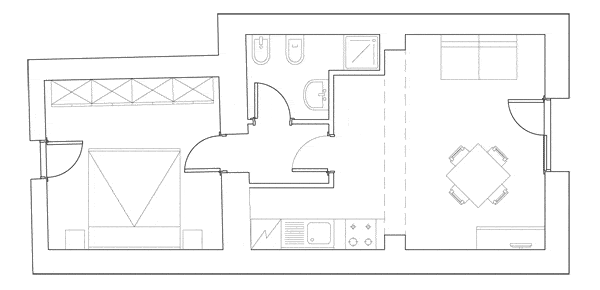 Entrando si accede ad un’accogliente zona giorno provvista di cucina perfettamente attrezzata e di un divano letto matrimoniale. Passando nel piccolo andito intermedio si ha accesso sia al bagno con doccia che alla camera da letto matrimoniale in cui è possibile sistemare all’occorrenza un letto singolo o una culla da campeggio.
